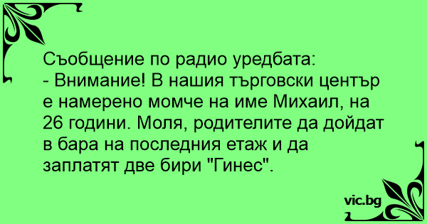 - Внимание! В нашия търговски център е намерено момче на име Михаил, на 26 години. Моля, родителите да дойдат в бара на последния етаж и да заплатят две бири "Гинес".