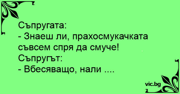 жена мужу: - дорогой, наш пылесос уже совсем не сосет. - интересно,... Жената на Генко казва: Дружина підходить до чоловіка: — Любий, наш пилосос зламався! — А що з ним? — Не смокче! — Прямо бісить, так? ..