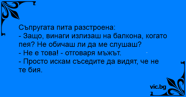 Комшии прават муабет: - Комшија зашто додека жена ти пее, ти секогаш излагаш надвор, или на тераса или на улица? - Па да, не сакам комшиите да помислат дека ја тепам!!