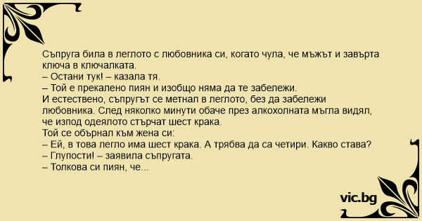 И естествено, съпругът се метнал в леглото, без да забележи любовника. След няколко минути обаче през алкохолната мъгла видял, че изпод одеялото стърчат шест крака.