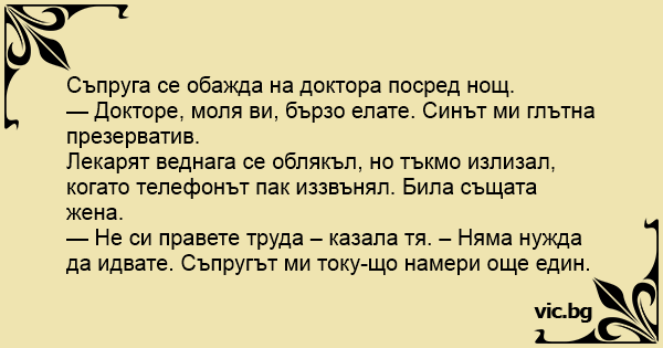 — Докторе, моля ви, бързо елате. Синът ми глътна пpeзepbatиb.