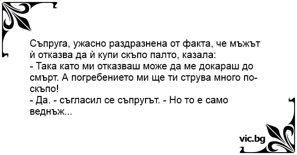 Съпруга, ужасно раздразнена от факта, че мъжът ѝ отказва да ѝ купи скъпо палто, казала: