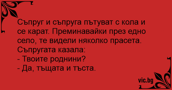 Чоловік із дружиною їдуть на машині й сваряться. Проїжджають через одне село і раптом бачать пару свиней. Дружина: — Твої родичі? — Ага, теща з тестем.