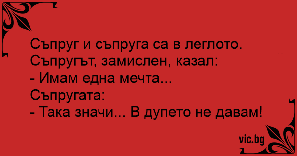 Съпруг и съпруга са в леглото. Съпругът, замислен, казал: