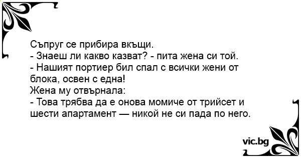 - Нашият портиер бил спал с всички жени от блока, освен с една!