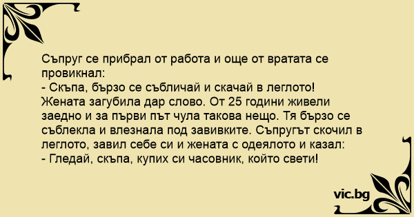 Жената загубила дар слово. От 25 години живели заедно и за първи път чула такова нещо. Тя бързо се съблекла и влезнала под завивките. Съпругът скочил в леглото, завил себе си и жената с одеялото и казал:
