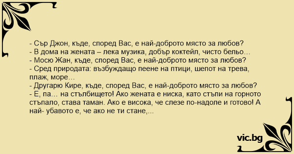 - Е, па… на стълбището! Ако жената е ниска, като стъпи на горното стъпало, става таман. Ако е висока, че слезе по-надоле и готово! А най- убавото е, че ако не ти стане, винаги можеш да кажеш: "Чекай, ма, чекай, че некой идва!"