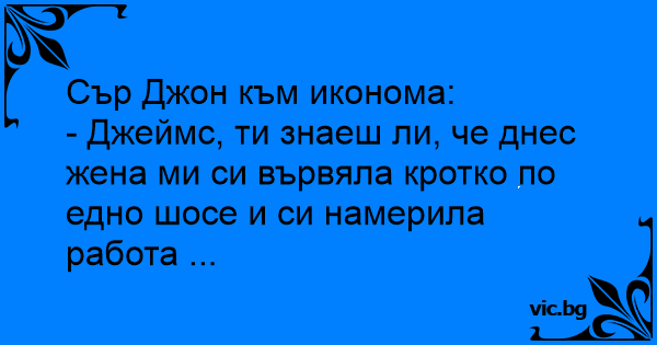 - Джеймс, ти знаеш ли, че днес жена ми си вървяла кротко по едно шосе и си намерила работа ...