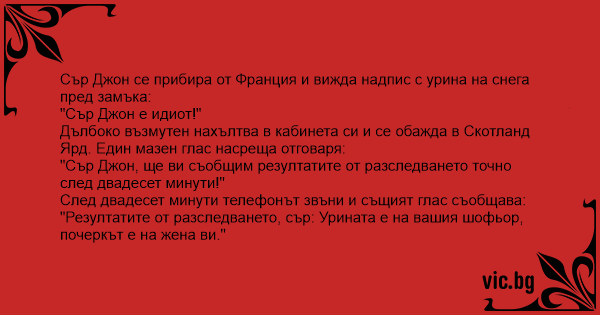 "Резултатите от разследването, сър: Урината е на вашия шофьор, почеркът е на жена ви."