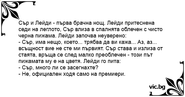 Сър и Лейди - първа брачна нощ. Лейди притеснена седи на леглото, Сър влиза в спалнята облечен с чисто черна пижама. Лейди започва неуверено: