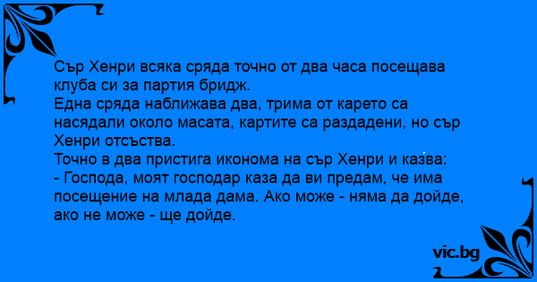 Сър Хенри всяка сряда точно от два часа посещава клуба си за партия бридж.