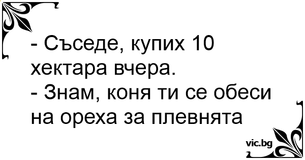 - Sąsiedzie! Dokupiłem sobie 10 ha pola! - Wiem. Pański koń powiesił się za stodołą.