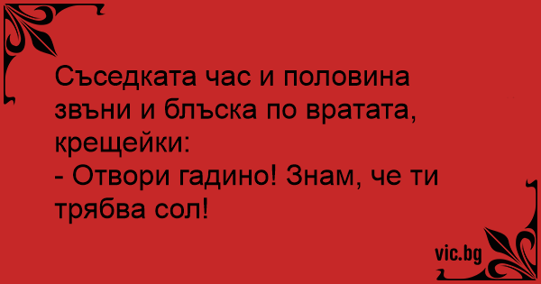Съседката час и половина звъни и блъска по вратата, крещейки: