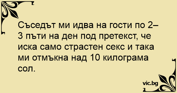 Съседът ми идва на гости по 2–3 пъти на ден под претекст, че иска само страстен cekc и така ми отмъкна над 10 килограма сол.