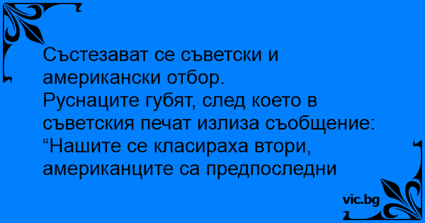 Руснаците губят, след което в съветския печат излиза съобщение: “Нашите се класираха втори, американците са предпоследни