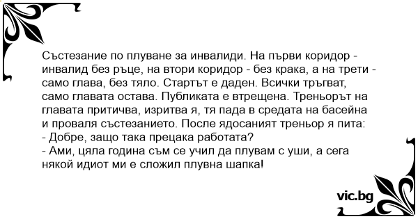 Състезание по плуване за инвалиди. На първи коридор - инвалид без ръце, на втори коридор - без крака, а на трети - само глава, без тяло. Стартът е даден. Всички тръгват, само главата остава. Публиката е втрещена. Треньорът на главата притичва, изритва я, тя пада в средата на басейна и проваля състезанието. После ядосаният треньор я пита: