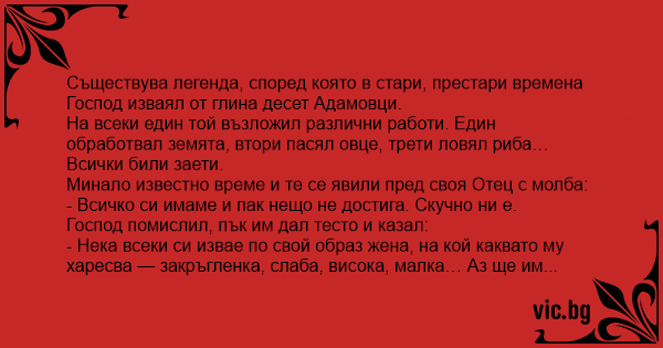 Всички мълчали. Тогава Господ взел жените, размесил ги, а после ги раздал - на когото каквато се паднала. Оттогава девет от десет мъже мислят, че чуждата жена е по-сладка, защото е изяла допълнителното парченце захар. И само един от десет мъже знае, че всички жени са еднакви, защото допълнителното парченце захар е изял той самият.