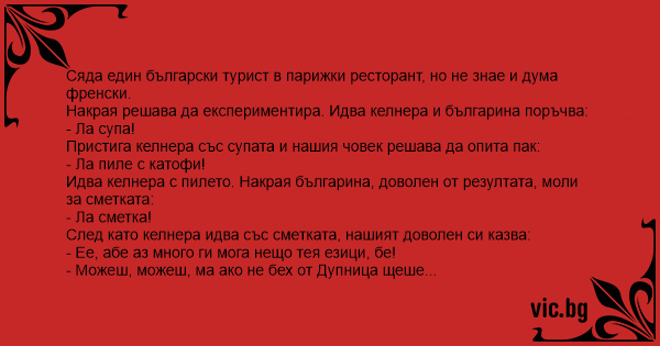 Отива българин във Франция с приятели, сядат в ресторант. Той започва да поръчва: