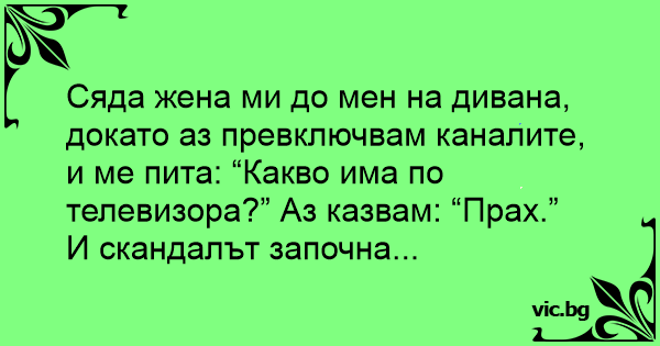 Сяда жена ми до мен на дивана, докато аз превключвам каналите, и ме пита: “Какво има по телевизора?” Аз казвам: “Прах.”