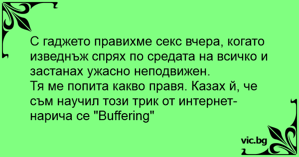 Lui e lei fanno l'amore. All'improvviso lui si ferma è rimane come congelato. Lei lo guarda stupefatta e chiede: - Ma sei normale, cosa stai facendo? - Cara, questo è il nuovissimo trend nei film porno su Internet – si chiama buffering.