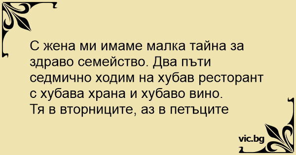 Mi esposa y yo tenemos secretos para que dure el matrimonio: Dos veces a la semana, vamos a un agradable restaurant, un poquito de vino, buena comida y buena compañía. Ella va los martes yo voy los...