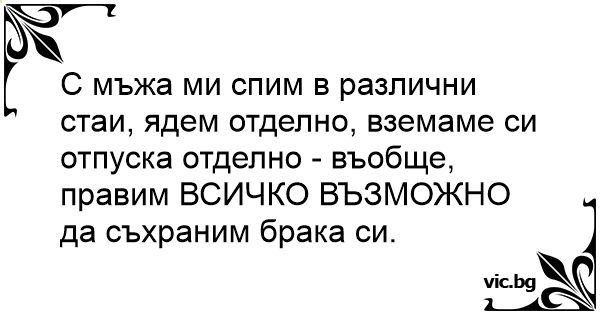 С мъжа ми спим в различни стаи, ядем отделно, вземаме си отпуска отделно - въобще, правим ВСИЧКО ВЪЗМОЖНО да съхраним брака си.