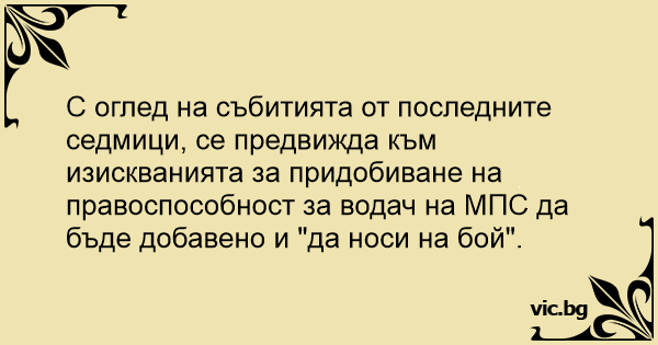 С оглед на събитията от последните седмици, се предвижда към изискванията за придобиване на правоспособност за водач на МПС да бъде добавено и "да носи на бой".