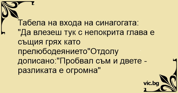 "Да влезеш тук с непокрита глава е същия грях като прелюбодеянието"Отдолу дописано:"Пробвал съм и двете - разликата е огромна"