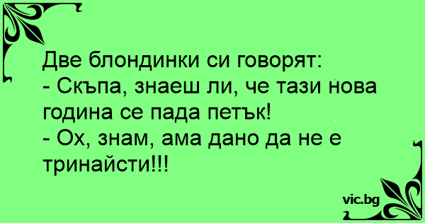Дві білявки: — А ти знаєш, що цього року Новий рік припадає на п’ятницю?! — Ой. Лише б не п’ятниця 13-те…