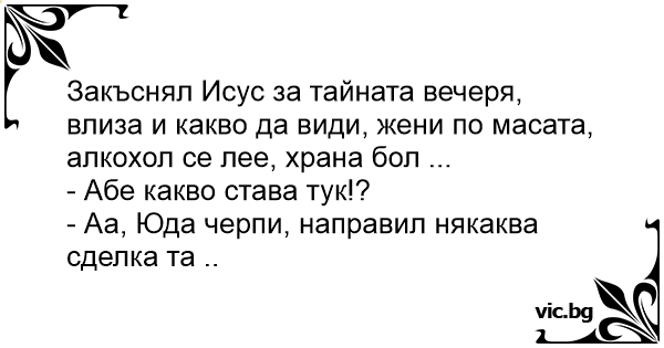 Пристига Исус на тайната вечеря, а там тече щур купон, всички ядат, пият и се забавляват, и никой не му обръща внимание...