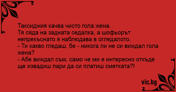 Beszáll a taxiba egy teljesen meztelen nő. A taxis tágra meredt szemekkel bámulja. A nő egy idő után megunja, és rászól: - Mi van? Nem látott még pucér nőt? - Azt már láttam, csak arra vagyok... Заходить в бар абсолютно гола жінка. Підходить до барної стійки, сідає... Бармен на неї уважно дивиться. Вона йому: - Ну чого витріщився? Голої жінки ніколи не бачив? Він: - Та жінку-то я бачив.... Зупиняє таксі оголена жінка. Таксист усю дорогу з неї очей не зводить. Вона обурюється: - Ти що, голих жінок не бачив? - Та мені байдуже, чи ви в одязі чи без! Я оце думаю, звідки ви гроші... Goła kobieta wieczorem na ulicy zatrzymuje taxi, wsiada i podaje swój adres domowy. Kierowca cały czas zerka do lusterka. - Co, gołej baby pan nie widział? - pyta kobieta. - Widziałem, widziałem,... A mulher entra no bar nua e  pede uma cerveja. O dono do bar a olha dos pés à cabeça, depois vai ao freezer e pega uma cerveja geladíssima. Ela toma rapidamente e pede outra. O dono do bar olha... Un joven muy desinhibida entra totalmente desnuda a un bar. Ubica al camarero y le dice: -¡Camarero! ¡Deme una cerveza bien fría! El camarero no atina a nada, y se queda quieto mirándola. -¿Qué le pasa? -dice la chica- ¿Nunca ha visto una mujer desnuda? -¡Porsupuesto! Muchas veces. -¿Y qué mira... Uma mulher entra no bar nua, e o dono fica vendo todo se tremendo aí ela senta no balcão e pede uma cerveja, um bife e um refrigerante ai o cara faz rapidinho e fica olhando para ela se tremendo. A mulher pergunta: — Você nunca viu uma mulher pelada? E ele responde: — Mulher pelada eu já vi ,... A garota totalmente nua entra num bar e pede um uísque. O barman despeja a bebida num copo, entrega-lhe e fica olhando fixamente para o corpo dela. Ela começa a bebericar o uísque e o barman, continua firme com os olhos em cima dela. Até que ela não agüenta: — O que foi? Nunca viu uma mulher nua?... Заходит в бар абсолютно обнаженная дама. Подходит к барной стойке, присаживается... Бармен на нее внимательно смотрит. Она ему: Νυχτερινή βάρδια ο ταξιτζής, μόνος στην πιάτσα και περιμένει πελάτη. A total naked woman rushed in a taxi. В такси села голая девушка и молчит. Таксист осмотрел ее с ног до головы. Она ему: Πόθεν Noaptea in Taxi intra o femeie goala. Soferul o priveste Uimit: - Ce te holbezi la mine? N-ai mai vazut femei Goale? - Ba da. Dar ma gandesc de unde vei scoate banii Pentru cursa! Een dronken vrouw sprong in New York helemaal naakt in een taxi. De Taxi-chauffeur zat met grote ogen naar de naakte vrouw te kijken en maakte geen aanstalten om de auto te starten. De naakte vrouw... Kadının biri çıplak olarak taksiye binmis. Şoför ikide bir dikiz aynasindan kadına bakiyormuş. Kadın; - Ne bakiyorsun sen hayatinda hiç çıplak kadın görmedin mi? Adam: - Yok ben ondan değil, parayı...