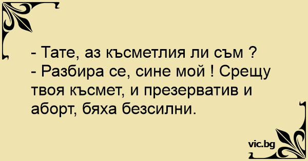 - Тате, аз късметлия ли съм? - Да, синчето ми! Срещу тебе нито презерватив, нито аборт помогнаха…