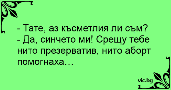 - Тате, аз късметлия ли съм? - Късметлия си, сине. Теб, нищо не може да те спре в живота - ни презерватив, ни аборт...