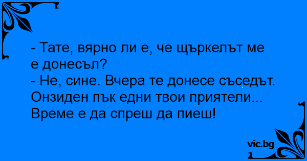 - Не, сине. Вчера те донесе съседът. Онзиден пък едни твои приятели... Време е да спреш да пиеш!