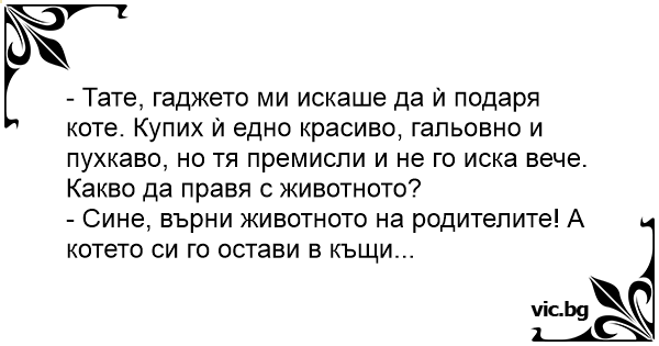 - Тате, гаджето ми искаше да ѝ подаря коте. Купих ѝ едно красиво, гальовно и пухкаво, но тя премисли и не го иска вече. Какво да правя с животното?