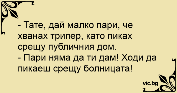 - Тате, дай малко пари, че хванах трипер, като пиках срещу публичния дом.