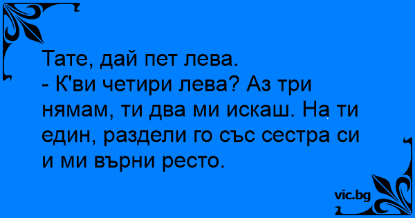 - К'ви четири лева? Аз три нямам, ти два ми искаш. На ти един, раздели го със сестра си и ми върни ресто.