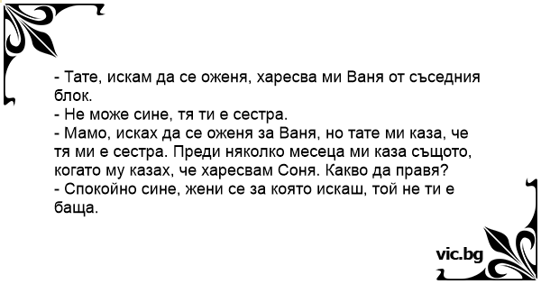 - Мамо, исках да се оженя за Ваня, но тате ми каза, че тя ми е сестра. Преди няколко месеца ми каза същото, когато му казах, че харесвам Соня. Какво да правя?