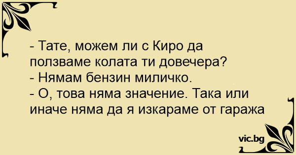 - Tata, ne Poti imprumuta masina, mie si prietenului meu? - Nu mai am deloc benzina in rezervor, draga mea. - Nici o problema, oricum nu intentionam sa iesim din Garaj cu ea.