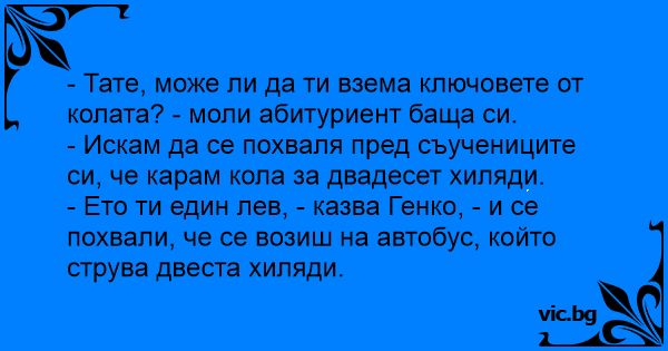 - Ето ти един лев, - казва Генко, - и се похвали, че се возиш на автобус, който струва двеста хиляди.