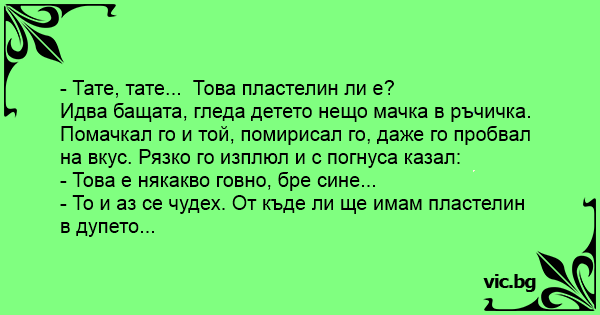 Идва бащата, гледа детето нещо мачка в ръчичка. Помачкал го и той, помирисал го, даже го пробвал на вкус. Рязко го изплюл и с погнуса казал: