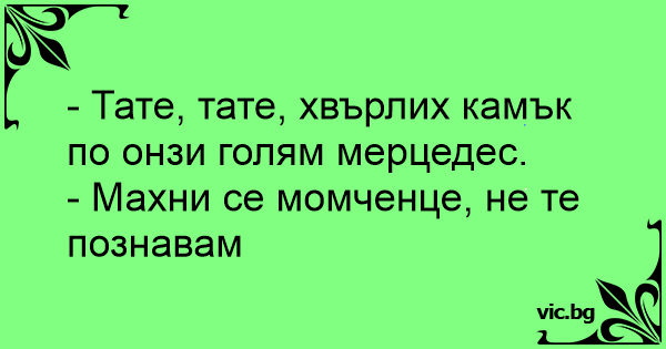 - Тате, тате, хвърлих камък по онзи голям мерцедес.- Махни се момченце, не те познавам 1 0 0 Тато, само што му ја погодив со камен шофершајбната на она БМВ. Знаеш ли какви парченца се разлетаа? Български Вицове