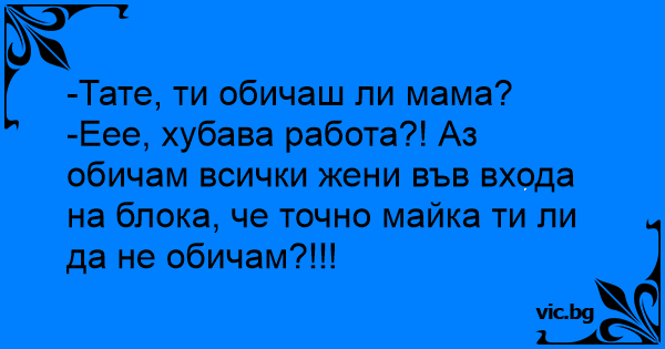 -Еее, хубава работа?! Аз обичам всички жени във входа на блока, че точно майка ти ли да не обичам?!!!