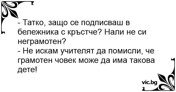 - Татко, защо се подписваш в бележника с кръстче? Нали не си неграмотен?