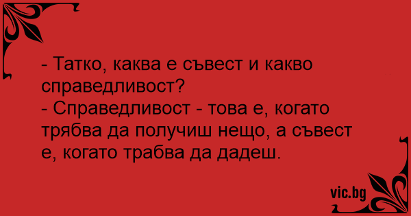 - Справедливост - това е, когато трябва да получиш нещо, а съвест е, когато трабва да дадеш.