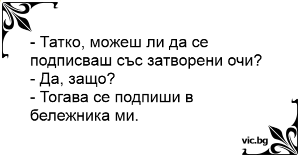 - Тату, а ти можеш поставити підпис із закритими очима? - Так, синку. - Тоді закрий очі та підпиши мій щоденник.