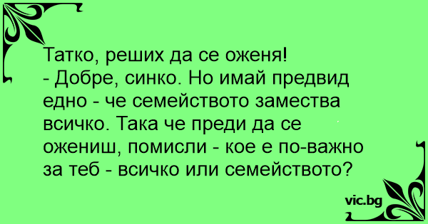 - Добре, синко. Но имай предвид едно - че семейството замества всичко. Така че преди да се ожениш, помисли - кое е по-важно за теб - всичко или семейството?