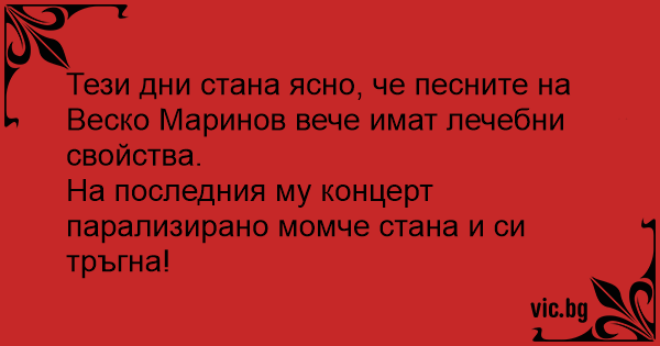 Тези дни стана ясно, че песните на Веско Маринов вече имат лечебни свойства.