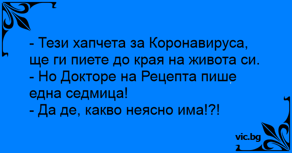 Во болница докторот му се обраќа на пациент: - Овие апчиња за лечење на Корона вирусот ќе мора да ги пиете до крајот на животот. - Ама докторе, сте ми дале рецепта само за една недела... - Е да де,...