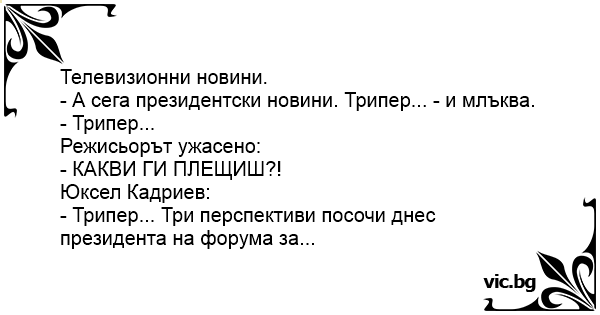 - А сега президентски новини. Трипер... - и млъква. - Трипер...